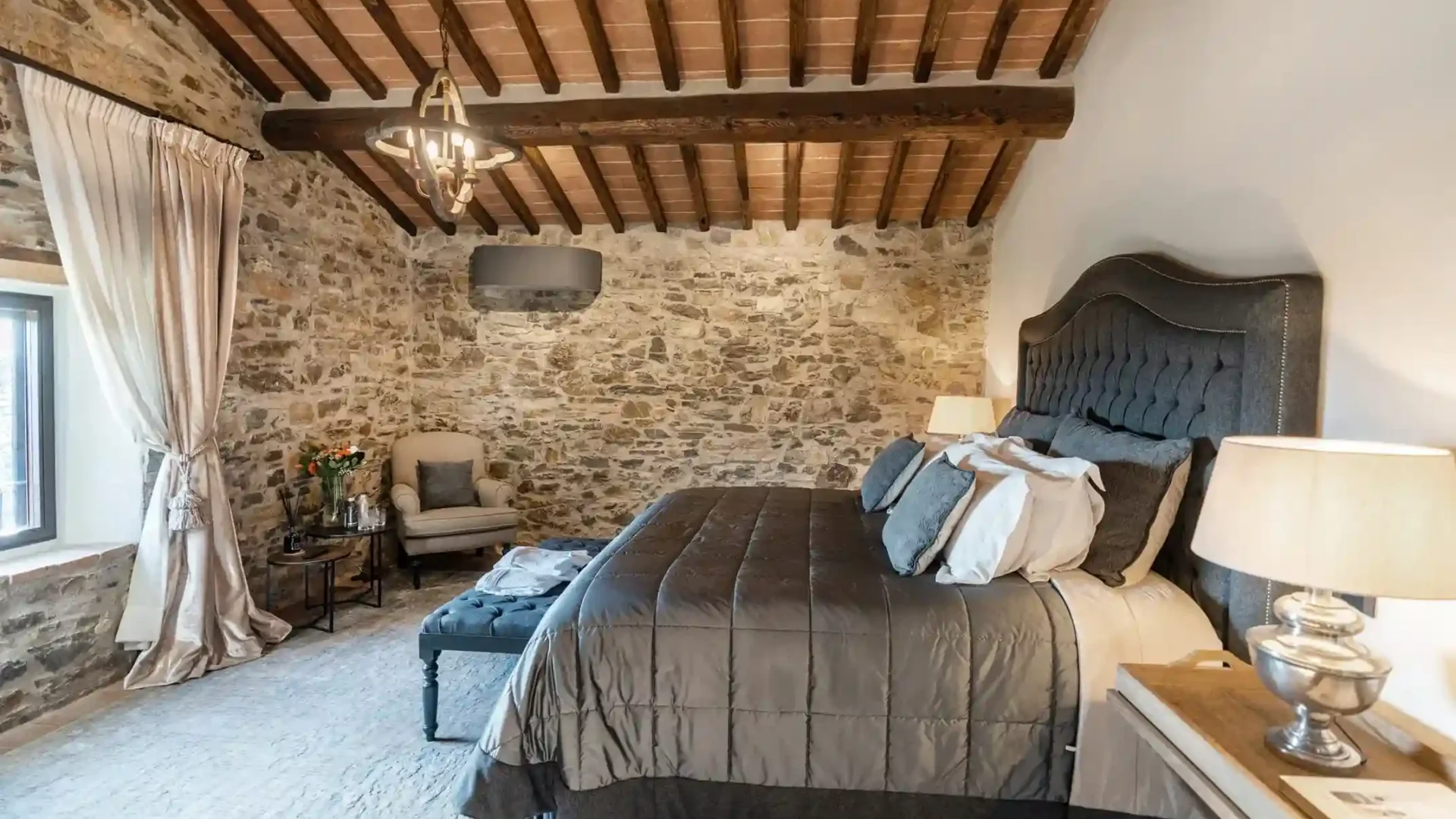 All of the villa’s interiors are hand-crafted, showcasing traditional Tuscan techniques and architectural elements. Here, you will find stone walls built with materials collected from the fields surrounding the property, marble or travertine walls hewn from local Tuscan marble quarries, pietra serena sinks formed from a single piece of stone and terra cotta floors.